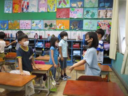 授業の後半には松元先生が「nine people.」と言ったら9人で集まる活動もしました。3,4人の少人数であればすぐに集まることができるのですが,9人などの大人数で集まるときはとても難しそうでした。その時に「一人多いし私抜けるわ。」と言ってまわりを見て行動出来ていたり,「あと2人来て〜。」と指も使ってアピールしている姿も見られたりと,どうすれば早く集まれるかを一生懸命考えて行動できていました。