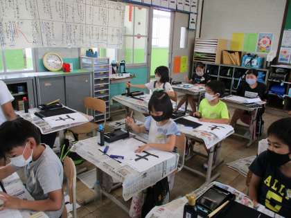 書写の「たて画」の筆使いの学習で,「土」という漢字を書きました。たて画を書くときの始筆・送筆・終筆のポイントを意識しながら書くことができました。
