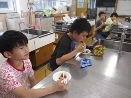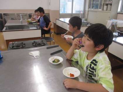 子どもたちにとってはピーマンが一番人気でした。半分に切ったピーマンにトマトケチャップとチーズをのせてオーブントースターで温めるとすごくおいしかった様子でみんなパクパクと食べていました。