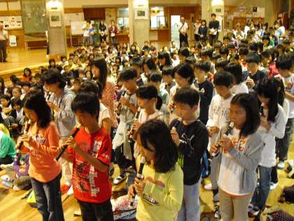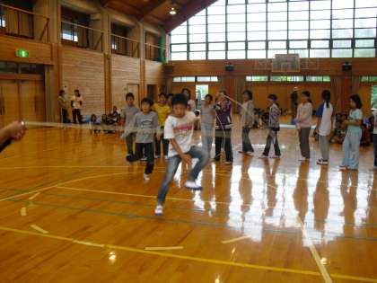 今日は雨が降っているので,体育館でドッジビーや大縄跳び大会をしました。クラス対抗で盛り上がっています。