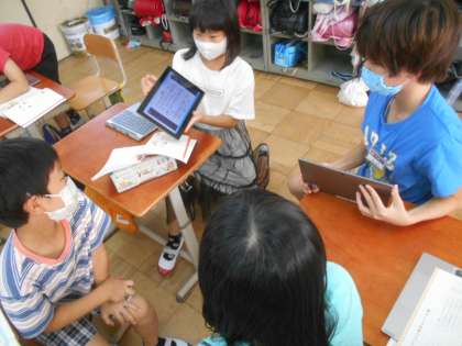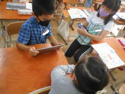 国語の「パンフレットを読もう」の学習で,パンフレットの工夫を見つけて交流しました。GIGA端末のノートに自分が見つけた工夫を書いて,友達に見せながら交流することができました。GIGA端末の使い方にも少しずつ慣れてきました。