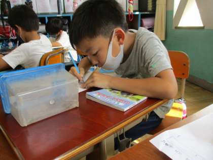 教室に戻ってからは虫の観察をしました。形や色,大きさ,どこにいたのかなど,細かく観察して,カードに書いていました。