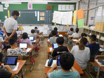4年生国語科「ごんぎつね」の学習を進めています。登場人物の行動や気持ちの変容を読み取った上で,登場人物の「ごん」と「兵十」は分かりあえたかどうかをそれぞれが考えました。「○○という理由で分かりあえた。」など,自分の考えをGIGA端末で打ち込んだり,それをもとに友達同士で話し合ったりと考えを深めることができました。