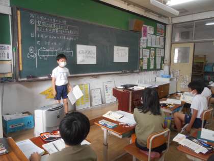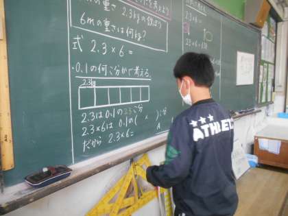 小数のかけ算の仕方を,整数の計算をもとにして考えました。考え方を説明したり,黒板に書いたりして,じっくりと考えることができました。「友だちの説明を聞いてわかった。」「できた。」と実感できるのは素敵なことですね。学校でみんなで学習する良さを感じた時間でした。