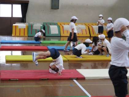 体育では,エンドボールが終わり,マット運動を頑張っています。子どもたちは,今できる技を組み合わせたり,もう少しでできそうな技を練習したりしています。子どもたちは,「もっとできる技を増やしたい」「もっときれいに技をきめたい」と,工夫しながら一生懸命に練習に取り組んでいます。子どもたちができるようになった技を,お家でもぜひ見てあげてください。