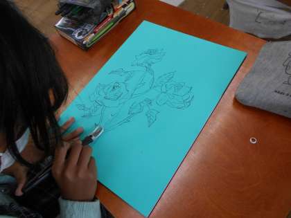 試し彫りを行い,彫刻刀の扱いに慣れた上で,いよいよ本番です。慎重に慎重に掘り進める姿が見られました。世界に一つだけの自分の素敵な「花」。一体どんな仕上がりになるの今後が楽しみですね。