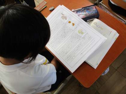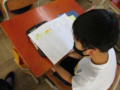 国語科では「食べ物のひみつを教えます」の学習を終えました。一人一人が自分の興味のある食べ物を選び,本を使ってその食べ物のひみつを調べました。調べたことを文章にまとめたので,友達の文章を読み,交流しました。普段何気なく食べている食べ物ですが,いろいろな姿に形を変えていることが分かりました。分かりやすい文章になるように,絵をつけたり,文章の組み立てを考えながらまとめることができました。