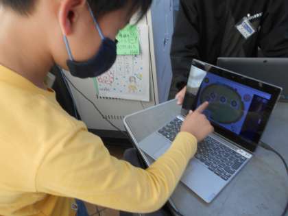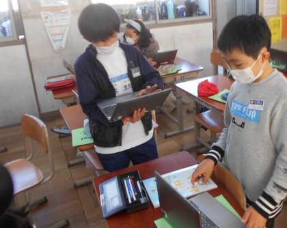 「what do you want?」,「I want tomatos.」,「How many?」「Two please.」…とたずねる側と答える側に分かれて,友達のほしい食材についてたずね合う活動を行いました。相手の欲しい食材を自分なりにレイアウトして,オリジナルピザを作成しました。GIGA端末をもってコミュニケーションをしている姿に大変意欲を感じられました。次回も引き続き行います。楽しみですね。