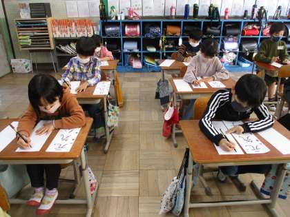 「元気な子」を集中してフェルトペンで書きました。ひらがなは漢字より少し小さめに,とめ・はね・はらいに気をつけて書くなど,集中して書くことが出来ていました。これからも文字を書くときは形などにも注意しながら書いてほしいと思います。