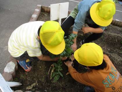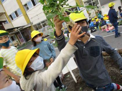 桂高校でダイコンの抜き方を学んだので,そのまま小学校の畑で育てていたダイコンも抜きました。桂高校より小さかったですが,一生懸命お世話をしてきて愛情たっぷりのダイコンを抜くことが出来たので,子どもたちは大喜びでした。