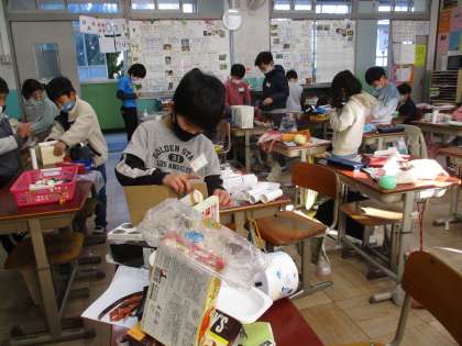 図画工作科の「ともだちハウス」を子どもたちはとても楽しみながら作っています。小さな友達がどんぐりだったり,小石だったり貝だったりと思い思いの友達にお家を作っています。