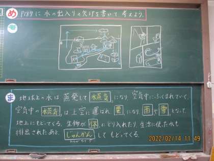 まずは,地球上の水はどのようにめぐっているのかを教科書の絵を参考に考え,矢印を書込み,動きを考えていきました。