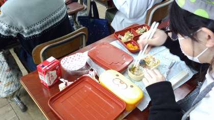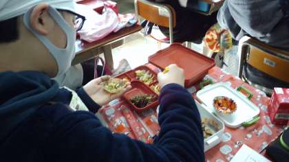 次に,そのバランスを意識しながら,中学校の給食を自分のお弁当箱に詰め替えてみました。