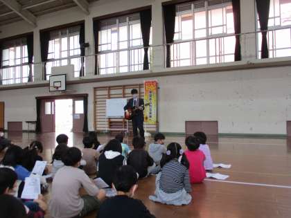 川岡小学校創立150周年のために校長先生が作ったテーマソングを,今日3年生の前で歌ってくださいました。