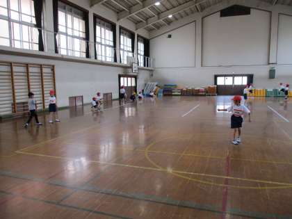 体育科の学習で,「とびあそび」をしています。今回は「じゃんけんとびあそび」をしました。グーで勝ったら「グリンピース」,パーで勝ったら「パイナツプル」,チョキで勝ったら「チヨコレイト」で一歩ずつ跳びながら進みます。班で楽しみながら活動することができました。