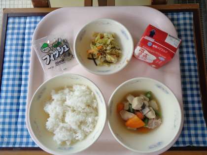 今日の給食は,ごはん・なま節とたけのこの煮つけ・かきたま汁・牛乳でした。なま節を煮たうまみたっぷりの煮汁でたけのこと人参を煮ました。なま節もたけのこも今が旬です。春を感じられる献立でした。