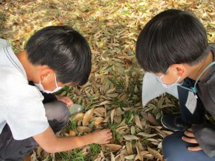 理科では,校庭にいる生き物や植物などを見つけに行きました。その後,見つけたものを伝え合いました。見つけたものをわかりやすく伝えるためには,色・形・大きさをポイントにして伝えるといいとわかりました。