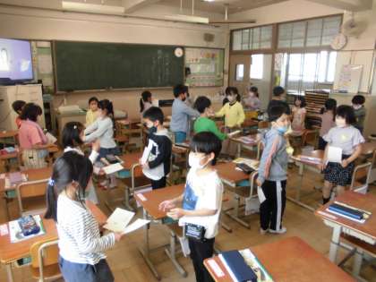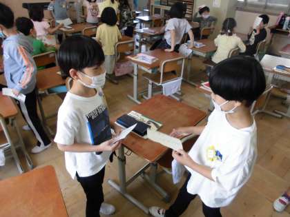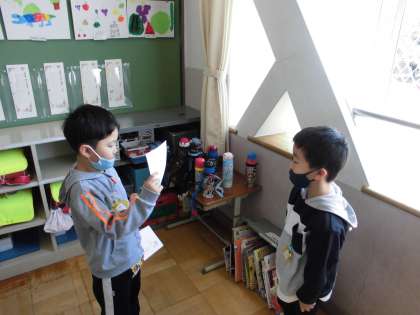 国語科で「どうぞよろしく」の学習をしました。自己紹介を兼ねて,自分で作った名刺を交換しました。「ぼくの名前は○○です。好きな恐竜は,ティラノサウルスです。どうぞよろしくおねがいします!」とゆっくりはっきり話すことができていました。