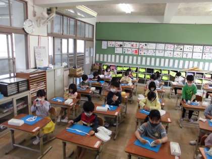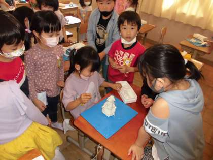「遊園地やで。長い長い滑り台があるねん。」「恐竜やねん。かっこいいやろ。」「迷路をつくったで。難しいで。」などと鑑賞タイムは,とても楽しそうに話していました。