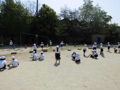 体育科で「とびあそび」をしています。ゴム跳びや箱跳びをしながらジャンプの運動をしました。「ゲームみたいで楽しい!」と嬉しそうでした。
