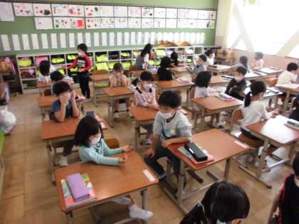 算数科「かずとすうじ」の学習をしています。5つのおはじきを両手に分けて持ち,一方を友達に見せて,もう一方の手に,おはじきがいくつあるか当てっこゲームをしました。「右手に3個やから…左手は2個!」「右手に1個やから…あ,左手は4個!!」などと楽しそうに活動していました。