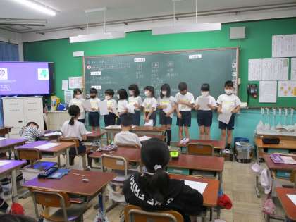 川岡6つのこころくばりの一つである「す・か・いのあいさつ」ができているかを振り返りました。そして,あいさつには相手がいることに気付き,あいさつをして相手にどんな気持ちになってほしいかを考えました。「うれしい気持ちになってほしい。」「心がぽかぽかしてほしい。」など相手の気持ちを考えた意見がたくさん出てきました。そこで,一人ひとりが『す・か・いあいさつ宣言』を立てました。自分がどういう気持ちで「す・か・いのあいさつ」をするのかを考え,明日から実践してみます。相手の気持ちを考えた素敵なあいさつが行き交う様子が楽しみです。