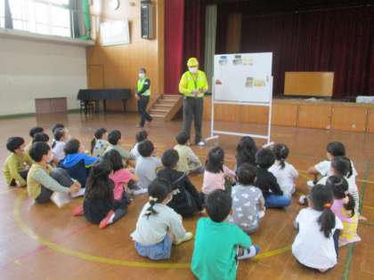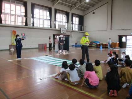 今日は交通安全課の方々に来ていただき,交通安全教室がありました。体育館には,実際の道を想定したコースが作られており,学んだルールをしっかりと守れるかを確かめました。横断歩道を渡るときは,左右の安全確認だけでなく,車に向けて「わたります」と手を挙げ,目線を合わせて合図を送る「合図横断」が大切だと教えていただきました。
