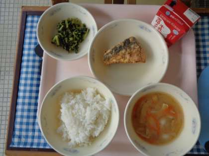 今日の給食は,ごはん・さばのたつたあげ・大根葉のごま炒め・いものこじる・牛乳でした。
