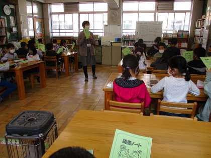 国語の「図書館の達人になろう」の学習で,学校司書の石黒先生に図書館のくふうを教えてもらいました。本のラベルや本の配置,本を探すときに案内図や検索を使うことを学び,子どもたちは,図書館への興味が高まったようでした。