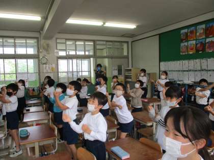毎日朝の時間に「めざめエクササイズ」をしてから1日が始まります。音楽にのりながら楽しく体を動かしています。朝から体を動かすと,頭も体もスッキリして学習活動にも力が入ります。