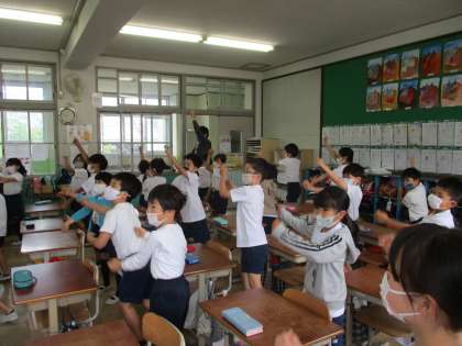 今朝は校長先生も一緒にエクサイズをしました。とても楽しくてエクササイズが終わっても「もう1回したい!!!」とのリクエストがあるほど,子ども達は「めざめエクササイズ」が大好きです。