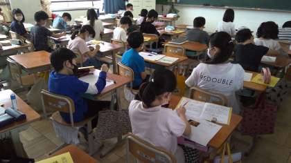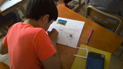 心にとまった一枚の写真から,想像をふくらませて絵にあらわしています。同じ写真でも想像のふくらみ方が違うので,みんなの作品の完成が楽しみです。