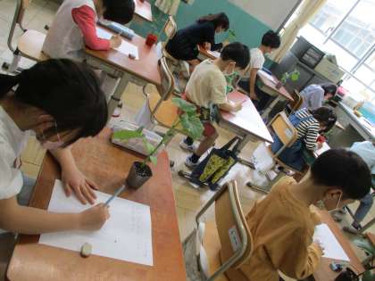 自分が選んだ苗を観察しました。目で見て形や色を確かめたり,においをかいでみたりと五感を使って観察できました。これからどんな風に大きくなっていくのかとても楽しみです。
