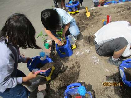 空っぽの植木鉢に土を入れて苗を植えました。「これから毎日お水をあげないと。」や「ミニトマトが20個ぐらいできるかな。」と成長をとても楽しみにしています。