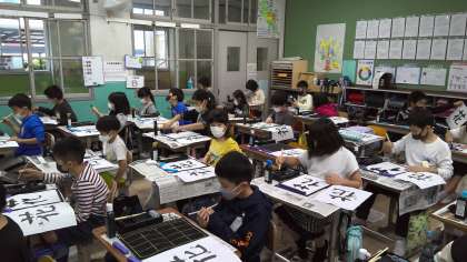 4年生になって初めての習字。子ども達はお手本を見ながら真剣に書いていました。