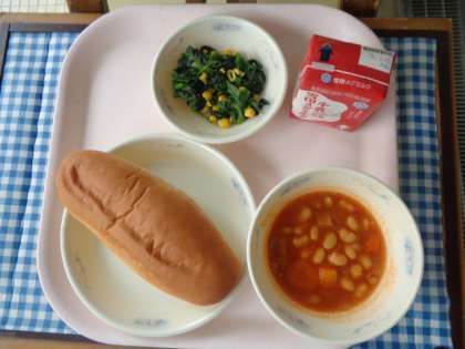 今日の給食は,ミルクコッペパン・ポークビーンズ・ほうれん草のソテー・牛乳でした。