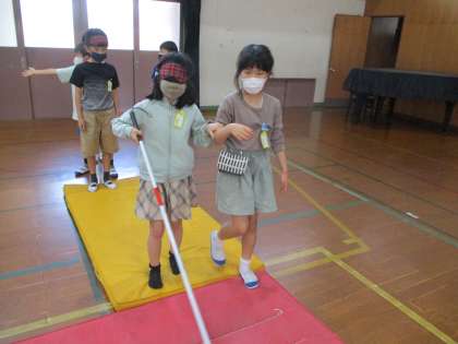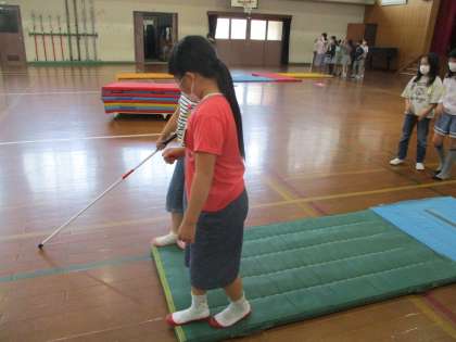 アイマスクと白状を使って,実際に歩く活動をしました。