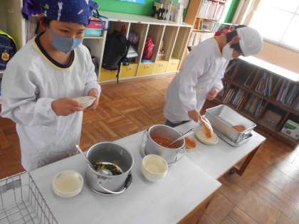 掃除や給食当番の様子です。掃除や給食当番などは,全員で協力して頑張っています。高学年が低学年に教えてあげる姿も見られ,嬉しく思っています。