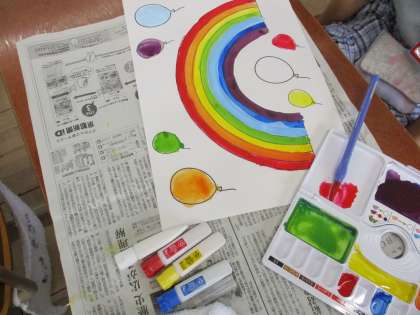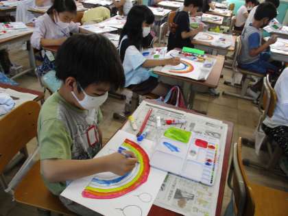 図画工作科では,2回目の絵の具の学習をしました。今回は,赤・黄・青・白の絵の具を混ぜて,虹の7色をつくりました。子どもたちは,色の変化に楽しみながら,一人一人違った色をつくり,素敵な虹を描くことができました。