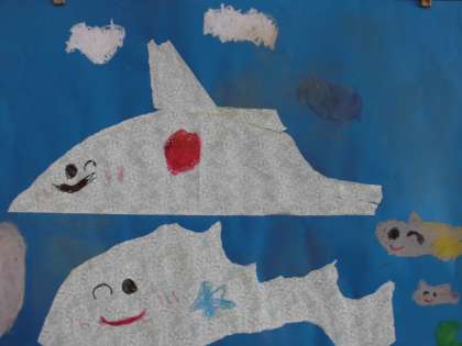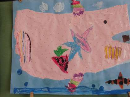 図画工作科「やぶいたかたちからうまれたよ」の絵が完成しました。破いた包装紙の形を生かして,素敵な作品に仕上がりました。