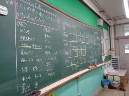 社会科の学習で水が生活場面のどんなところで使われているかを考えました。