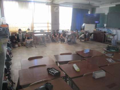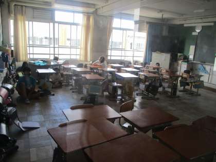 教室内でバリケードをつくり,静かに待機していました。