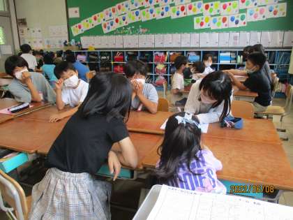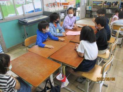 たてわり結成式がありました。それぞれのグループの教室に分かれて,自己紹介をした後,グループごとに遊びました。絵しりとりをしたり,マジカルバナナをしたりして楽しみました。教室に帰ってきた子どもたちは「楽しかった〜。」「また遊びたい。」と笑顔いっぱいでした。
