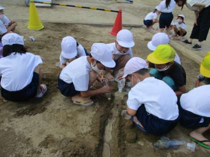 図画工作科「すなやつちとなかよし」では,砂場で学習しました。「川ができたよ!」プリンカップを使って「お城を作ってるよ!」など,一人一人楽しみながら取り組むことができました。