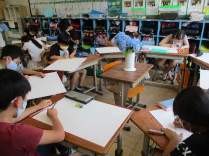 学校の校庭のそばに咲いていたあじさいをみんなに見てもらい,絵にかいてもらいました。「あじさいは小さな花がたくさん集まって大きな花になっているんだ。」と,改めて発見することがたくさんありました。みんな集中して取り組むことができました。来週は絵の具で色をつけます。ひとりひとり違う素敵なあじさい。完成が楽しみです。