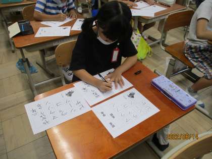 油性ペンで,「マラソン,ラッコ,シーツ,ピザ」を丁寧に書きました。字の間違いはもとより,とめやはね,はらいに気を付けて書きました。姿勢を正してゆっくりと書くときれいに書くことが出来ますね。