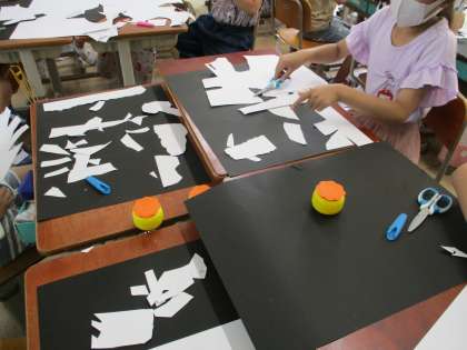 図画工作科では「はさみのアート」の学習をしました。白の画用紙を自由に切り,黒の画用紙に並べながら,見えてきたものを表しました。子どもたちは,豊かな発想力で,海の中や,夏の空,モンスターなど,様々なものを表現していました。