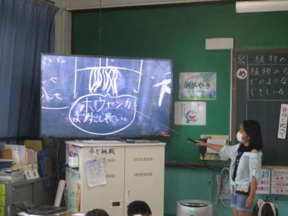 自分たちが育てているホウセンカ,少しずつ育ち方のちがいはありますが,ずいぶん育ってきた児童も多く見られます。「植物の体はどのような部分に分かれているのだろうか」という課題のもと学習を進めていきました。ホウセンカやヒマワリの,特に根の部分の様子やちがいについてどうなっているのかを予想する場面でたくさんの考えが出ました。意欲的ですね。すてきです。