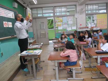 西京警察署の方に社会のルールについてたくさんお話をしていただきました。子どもたちは「落とし物は交番に届けよう。」や「人のものは勝手に取ったらいけない。」,「いかのおすしはやっぱりとても大切だ。」など,警察署のスクールサポーター方の話を真剣に聞いて,しっかり考えられていました。