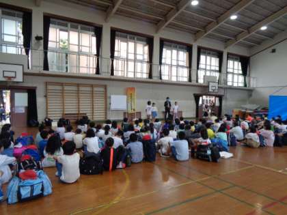 山の家に向けて出発式を行いました。楽しい2日間が待っていますね。